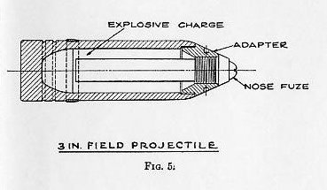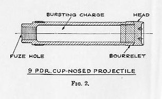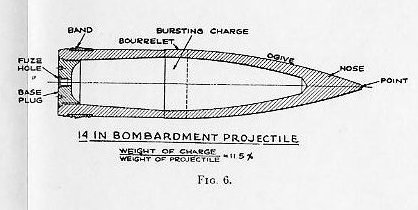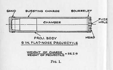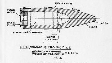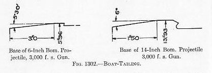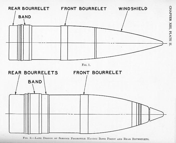 where S. D. = sectional density. w weight of projectile in pounds. A = area of bore, including grooves, in sq. in. This figure has frequent application in gun and projectile design. The sectional density varies from 0.635 for a 1-pounder up to 10.44 for a 16-inch, averaging approximately 0.6 of the caliber. The distribution of the weight in a projectile is a matter of considerable importance. As a general rule, the center of gravity should be in the longitudinal axis and close to or abaft the center of form. Slight variations in the location of the center of gravity, with respect to the center of form, have negligible effect on the dispersion. For instance, the center of gravity of an 8-inch projectile was moved back and forth 0.5 inch, in a series of firings, without showing any appreciable effect on the dispersion, and, similarly, the center of gravity of a series of 12-inch projectiles was moved to one side of the longitudinal axis, 0.013 inch, 0.039 inch, and 0.052 inch, respectively, without producing appreciable effect in the range or dispersion. 1308. The bourrelet (Plates I and II) is, as previously stated, the forward bearing of all projectiles while the after bearing is sometimes a bourrelet and in other cases only the rotating band is used for this purpose. The shell’s greatest diameter, neglecting the copper rotating band, is that of the bourrelet. This dimension is extremely important. The diameter of the bourrelet or bourrelets of every projectile is measured with ring calipers to guard against the possibility of an oversize in this dimension. The bearing surface of the bourrelet is generally about one-sixth caliber in width, that is, longitudinally with the projectile; and this surface is ground to a fine finish in order to reduce friction and wear of the lands of the gun. Some few small projectiles have no real bourrelet, the entire body of the projectile forward of the band replacing it. CHAPTER XIII, PLATE 1: SEE THE FOLLOWING, FIG.1, FIG. 2, FIG. 3, FIG. 4, FIG. 5, AND FIG. 6. |