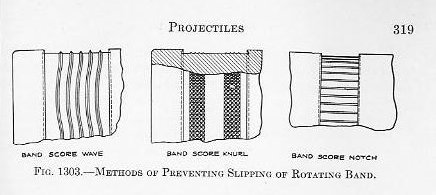 The band is secured in a score cut in the projectile body, there being a dovetail on each edge to assist in overcoming centrifugal force, and either waved ridges, longitudinal nicks, or knurling in the bottom of the score to insure against slipping during acceleration. The band is made as a ring of slightly greater internal diameter than that of the body and is slipped over the score while hot, and pressed radially into place in a powerful hydraulic press called a “banding press.” |