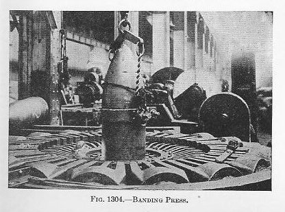 Figure 1304 shows a banding press consisting of a large number of hydraulic rams arranged radially. Each ram is fitted with a short segment of a circle for exerting pressure against the rotating band to cause the copper to flow into the securing dovetails, ridges, nicks, or knurling. The projectile with its loose rotating band is lowered, base down, into the banding press. The rotating band is then secured by having all hydraulic rams simultaneously exert pressure upon the rotating band. The length of the segments can be varied to suit the circumference of the projectiles of various calibers. 1310. The forward edge of the band is slightly conical and fits into a corresponding coned seat at the origin of rifling. The central portion of the band is generally cylindrical and of a slightly greater diameter than the diameter of the bore including grooves. An expression often used to obtain the diameter is D = C+2p +.02 where C is the caliber of the gun, and p the depth of the grooves. It will be observed (Fig. 1305) that on the rear part of practically all bands is a raised lip. This lip serves the purpose of insuring a good gas seal and at the same time, because of its considerably greater diameter, preventing over-ramming in a worn or eroded gun |