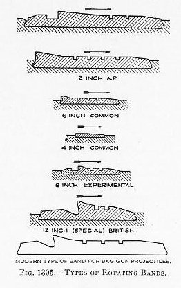 The bore of a gun becomes coppered after repeated firing, with a fine deposit of copper from the projectiles’ rotating bands. Frequently, also, the liner in a gun becomes slightly ridged, after repeated firing, particularly in wake of internal shoulders. A certain clearance must, therefore, be provided between the bourrelet and the lands. The standard U. S. Navy practice is as follows: (a) Up to and including 6-inch caliber, the bourrelet diameter is made 0.015 inch smaller than the bore and a minus manufacturing tolerance of 0.005 inch is allowed so the average radial clearance is 0.00875 inch. (b) 8-inch caliber and above, the bourrelet diameter is made 0.023 inch smaller than the bore and a minus manufacturing tolerance of 0.007 inch is permitted so the average radial clearance is 0.01325 inch. Failure to insure this minimum clearance might result in such a great “pressure of forcing” as would disrupt the gun. Clearances of 0.05 inch have practically no effect on dispersion, but it is reasonable to assume that unnecessary clearance can, at least, have no beneficial effect, and may have an injurious effect on the lands, due to the blows of possible wabbling. It is apparent, also, that the less the clearance, the more accurate will be the initial direction of the trajectory. 1309. The rotating band has three specific functions-to seal the bore, to steady and center the rear end of the projectile for projectiles not fitted with after bourrelet, and to rotate the projectile. It is also utilized to prevent over-ramming in worn guns and to hold the projectile in place during loading and elevating for firing. In addition to these functions, the band has considerable effect on the range, dispersion, muzzle velocity, and life of the gun. Note: Rotating bands are also called forcing bands. Until 1921 rotating bands were made of commercially pure copper for all minor and medium caliber projectiles, and of cupronickel alloy containing 2.5 per cent nickel for major-caliber projectiles, the nickel being added to secure greater strength. In 1921 the practice of using commercially pure copper for all rotating bands was adopted. As a general rule rotating bands are about 1/3 caliber in width. In some instances, particularly abroad, the width of a band is kept down to a maximum of about 1.5 to 2.0 inches, and where a greater strength is necessary two separate bands, separated by a short distance, are provided. This system has considerable merit. |