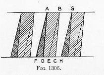 When the gun is fired and the pressure rises, the projectile is forced into the rifling which then engraves the band to fit the contour of the bore, and the revolution of the projectile ensues. It is easily seen that the driving face of the lands should be radial so that the rotative force will be applied normally. 1311. With uniform twist rifling the lands in the bore present a constant angle to the band. After the first engraving, therefore, there is no further flow of the metal in the bands other than the slight drag and wear due to friction. With parabolic or increasing twist rifling, however, the lands in the bore present a constantly increasing angle to the band. In this case, therefore, there is a continual flow of metal, due to the changing pitch of the thread. This condition is shown in Fig. 1306, which diagrammatically represents the parts of an engraved band covering three grooves in the rifling. |