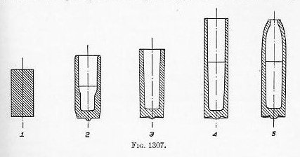 In some projectiles this is the only forging required, but generally the extrusion performed by the piercing die is insufficient to make the cavity long enough. In this case, which is quite general, the forging or blank is reheated, and placed in a draw-bench, the nose being placed in a die containing a circular hole slightly larger than the finished diameter, and it is then forced through this drawing die by a hydraulically operated plunger which is inserted in the already partially formed cavity. This drawing process forces the sides back over the plunger, thus extending the blank to the required length. In some cases more than one draw is required, and this is generally performed in one heat by forcing the forging through several rings or dies in succession in the same draw-bench. The method just described applies, of course, to open-base projectiles. Where the base is to be solid and the nose is to be open the same general process is followed, except that the projectile is worked from the nose instead of from the base. The blank is then generally annealed, or normalized, and if high physical properties are required, it may be heat-treated to secure them. It is then passed to the machine shop for finishing. The finishing consists in turning and boring to the correct dimensions and tolerances, banding, fitting the plug, painting the interior of the cavity, and inspecting and stamping for shipment. As a general rule all surfaces are finish machined except as noted below. Many efforts have been made to omit the machining of the cavity but the forge finish is not satisfactory because the forging temperature is so high that a rough and scaly surface results. Some projectiles are fitted with heavy nose or base plugs, others have smaller adapters to carry the fuze, and others may be designed to receive the fuze itself. In most of these classes the cavity is always of larger diameter than is the hole for these fittings. This condition is met in two ways. Where the hole is large and the amount of metal to be removed from the rough forged cavity is small, or where the projectile is completely heat-treated, the interior is finished in a boring machine or lathe, using a tool on the end of a bar which is inserted in the hole. This bar is swung on a pivot in order that the tool can be made to follow the desired contour of the interior. Where the cavity is large and entails the removal of considerable metal, or where the forward or after fuze or plug hole is so small as to render machining impracticable, an entirely different process called nosinq-in or basing-in, as the case requires, is employed. Here, prior to closing the nose or base, the inner portion of the cavity is machined to size while the outer portion of the cavity is machined to a cylindrical or nearly cylindrical size, any shoulders or seats being also partially machined. That part of the projectile which is to be closed in is then carefully heated in a non-oxidizing flame, and is then either forced, under hydraulic pressure, into a die which is cut to the proper exterior shape, or is pressed into shape under radial pressure. As was stated above, this process can be applied to either the ogive or the base. Figure 1307 shows the various stages of piercing, drawing, and nosing of a 6-inch army shell. This operation can be so satisfactorily performed that no machine work is necessary on the closed-in portion except the fitting of screw threads and gas-tight seats. It is generally customary to select tensile-test specimens from heats or lots after all forging or heating is completed, in order to insure that uniform and satisfactory results are being secured. The processes referred to above apply to practically all kinds of projectiles, except armor piercers and minor-caliber projectiles. Minor-caliber projectiles are generally machined from round rolled bars, the forging to shape with final finishing being more expensive than complete machining. Base plugs, fuze-hole plugs, adapters, and the miscellaneous interior parts of shrapnel, illuminating projectiles, gas and smoke projectiles, are manufactured by the various drop-forging, drawing, and machining processes covered in textbooks on mechanical processes. |