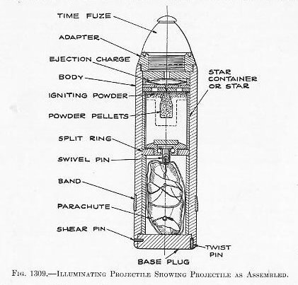 SPECIAL PROJECTILES. 1325. Shrapnel (Fig. 1308).- This type of projectile is designed for use against personnel and its only naval use is, therefore, in connection with landing parties, bombardment of fortifications, and attack upon aircraft. It is interesting to know that the name is derived from the inventor who brought it out in Europe in 1784. The most common form of shrapnel consists of a case in the rear of which is a black-powder bursting charge, connected to a nose fuze by a central explosion tube around which is packed a large number of lead (88 per cent)-antimony (12 per cent) balls held securely in place by a matrix of hot-poured resin. When the fuze acts the balls are expelled forward by the bursting charge and scatter in a cone-shaped cloud. Shrapnel are, however, frequently given other features. For instance, a high explosive may replace the resin to increase the violence of the burst and the area of damage; or there may be a heavy head with a high-explosive burster and suitable fuze in order to follow the cloud of balls with a secondary explosion, and, finally, the balls may be replaced by small hollow open-ended cylinders in which phosphorus or other incendiary compound is packed. The object of this design is to add, to the local explosion and distribution of missiles, the probability of creating a conflagration. This design is particularly valuable against aircraft of all descriptions, especially those which employ hydrogen. 1326. Illuminating projectiles. In this type we have a case, similar to a shrapnel case, with a very small burster in the front end just abaft the fuze, and an interior assembly of a star or candle with a parachute, and a very lightly held base plug. The explosion of the burster, or, as it should be called, the expelling charge, forces out the base and the interior assembly. It is quite desirable to expel the assembly with considerably velocity, at least 300 to 400 f. S. relative to the case, in order that it will have as small a velocity, in space, as is possible. It would be preferable to have the assembly expelled at the same velocity as the case is traveling, but at present this is not possible. The star or candle is a steel container in which is packed, under heavy pressure, a illuminating compound in which magnesium is an important constituent. The explosion of the expeller ignites the candle or star. The parachute is attached by means of shroud wires to the closed end of the star container and, in addition, the center of the parachute is attached to one end of a release device, the other end of which is attached to the star. The parachute is carefully folded and with the shroud wires and release wire is so rolled that upon expulsion it comes into action to retard and then support the star. The release wire, being intentionally short, holds the center of the parachute near the star so that the parachute spills most of the air with which it comes in contact. The release is so adjusted that when the star has been sufficiently retarded, the release wire is freed so that the parachute fully inflates and supports the star. |