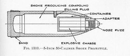 1327. Chemical projectiles.-It is not probable that heavy caliber projectiles and large bombs will be filled with gas for action against naval ships, as a filling of high explosive will do more damage, and hence will more quickly put a ship out of action. Chemical substances, therefore, may be expected to be confined to small caliber projectiles and small bombs for use against personnel in exposed stations. However, future developments may lead to the loading of all projectiles with at least a small amount of persistent gas in order to delay and hinder the making of repairs, to force the wearing of gas masks and the taking of other preventive measures with the resultant loss of fighting efficiency, and to cause a disastrous effect on morale in addition to producing actual casualties. Chemical artillery projectiles were first introduced during the World War, tear gas projectiles making their appearance as early as 1915. The following year projectiles loaded with a variety of toxic substances and mixtures were produced, including phosgene, smoke, and incendiaries. In 1917 the initial employment of mustard gas and its resultant efficiency as a casualty-producing agent led to a reduction in the number of chemical agents and an increase in the proportion of chemical projectiles. At the present time, in the Army, gas-filled projectiles are standard for the 75-mm. gun, the 155-mm. howitzer, and the 155-mm. gun. The standard fillings comprise mustard gas (a persistent vesicant), chloracetophenone (a persistent lachrymator), phosgene (a non-persistent lung irritant), and for smoke shells, white phosphorus. The use of lethal gases has been forbidden by international agreement by many nations. Plate IV shows the 75-mm., Mark II Army projectile, and Fig. 1310, a 5-inch 50-caliber smoke projectile. Chemical projectiles are quite similar to any high explosive thin-walled projectile so far as the projectile itself is concerned, the difference being in the kind of fuze, contents, and method of loading. The booster for the 75-mm. shell contains 35.4 grams of tetryl, which constitutes the entire bursting charge. The latter is held in place by a flanged copper tube which forms a well for the fuze. In chemical projectiles complete fragmentation is unnecessary, hence the contained explosive is sufficient only to insure that the projectile will be split open and the chemical contents disseminated. In liquid-filled projectiles, the more slowly rotating and inert liquid, acting against the inside surface, reduces the speed of rotation, and hence the stability of the projectiles. Compared to solid-filled projectiles, shorter ranges and greater dispersions will result. |