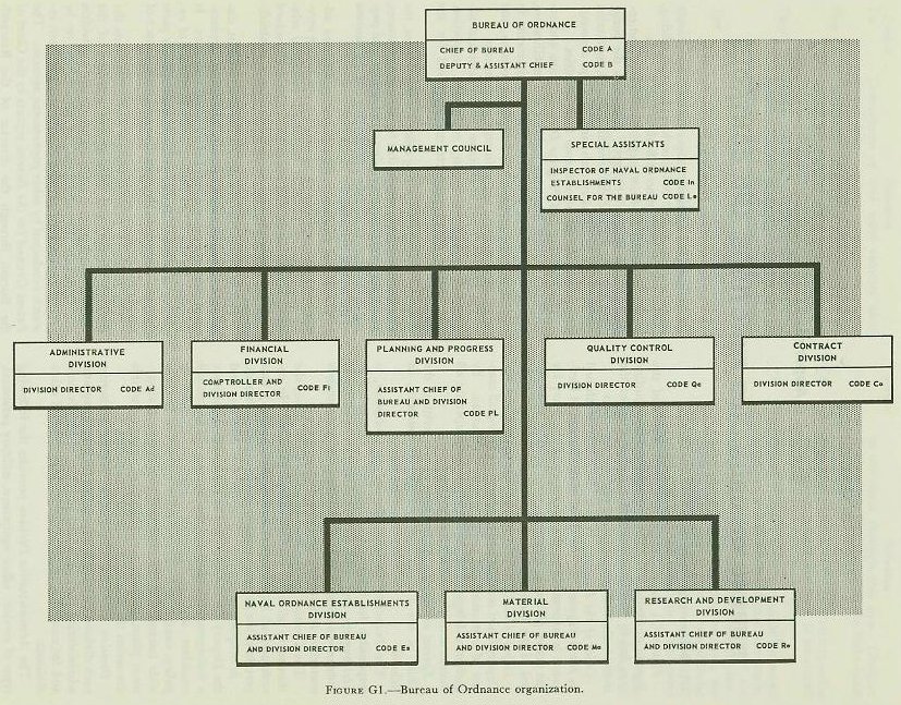 BUREAU OF ORDNANCE FUNCTIONS AND CONTROLS G1. Bureau organization Figure G1 shows the general organization of the Bureau of Ordnance. The paragraphs below outline very briefly the functions and responsibilities of the individuals and groups mentioned on the chart. |