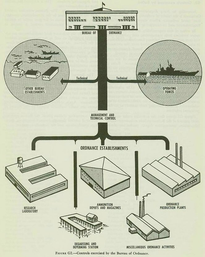 Management control. The routine administration of non-military matters at a naval activity is usually referred to as management control. The scheduling of the workload in terms of personnel, money, and facilities is-for example-a function of management control. Another function is the establishment of administrative policies covering such matters as civilian personnel relations. Figure G2 shows that the activities under management control of the Bureau include ordnance research laboratories, ammunition depots, production plants, and degaussing stations. This is a typical list, rather than an exhaustive one. Technical control. The Bureau exercises control over the methods used in the manufacture, stowage, issue, and transportation of the gear under its special cognizance. This specialized control is known as technical control. Naturally the ordnance field establishments are under the technical as well as the management control of the Bureau. At these establishments, BuOrd drawings and specifications set the standards for manufacturing processes. Directives and other communications specify what jobs are to be done and how the work shall be accomplished. The quality control program establishes manufacturing tolerances and methods of inspection. The Bureau exercises technical control over ordnance work at activities that are not under its management control. For example, advanced bases are under management control of the Bureau of Yards and Docks, but ordnance magazines and shops at these bases are under technical control of the Bureau of Ordnance. Again, ordnance activities in the operating forces are under technical control of the Bureau of Ordnance. At contracting civilian plants, the Bureau exercises technical control through contract provisions, drawings, specifications, and the inspection program. |